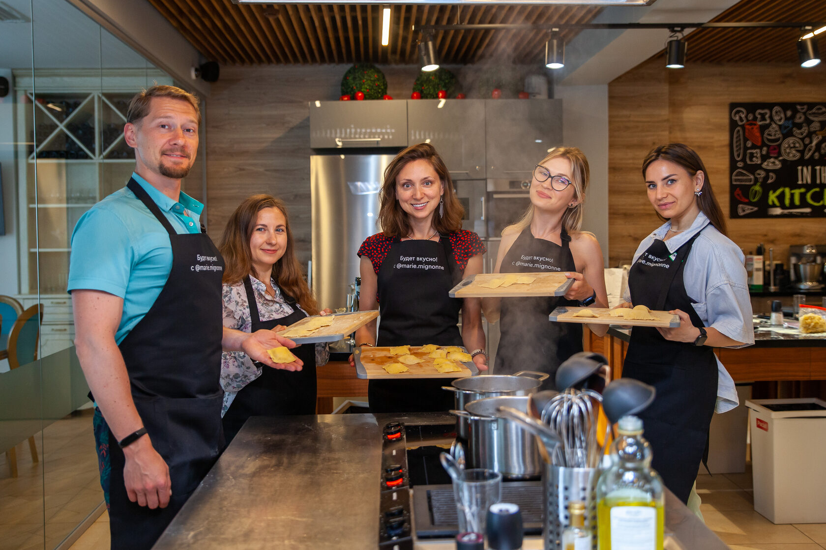 Всё включено в стоимость: продукты, алкоголь, чай, кофе, оборудование, фартуки, клининг, фотограф. Вам ни о чем не нужно беспокоиться.