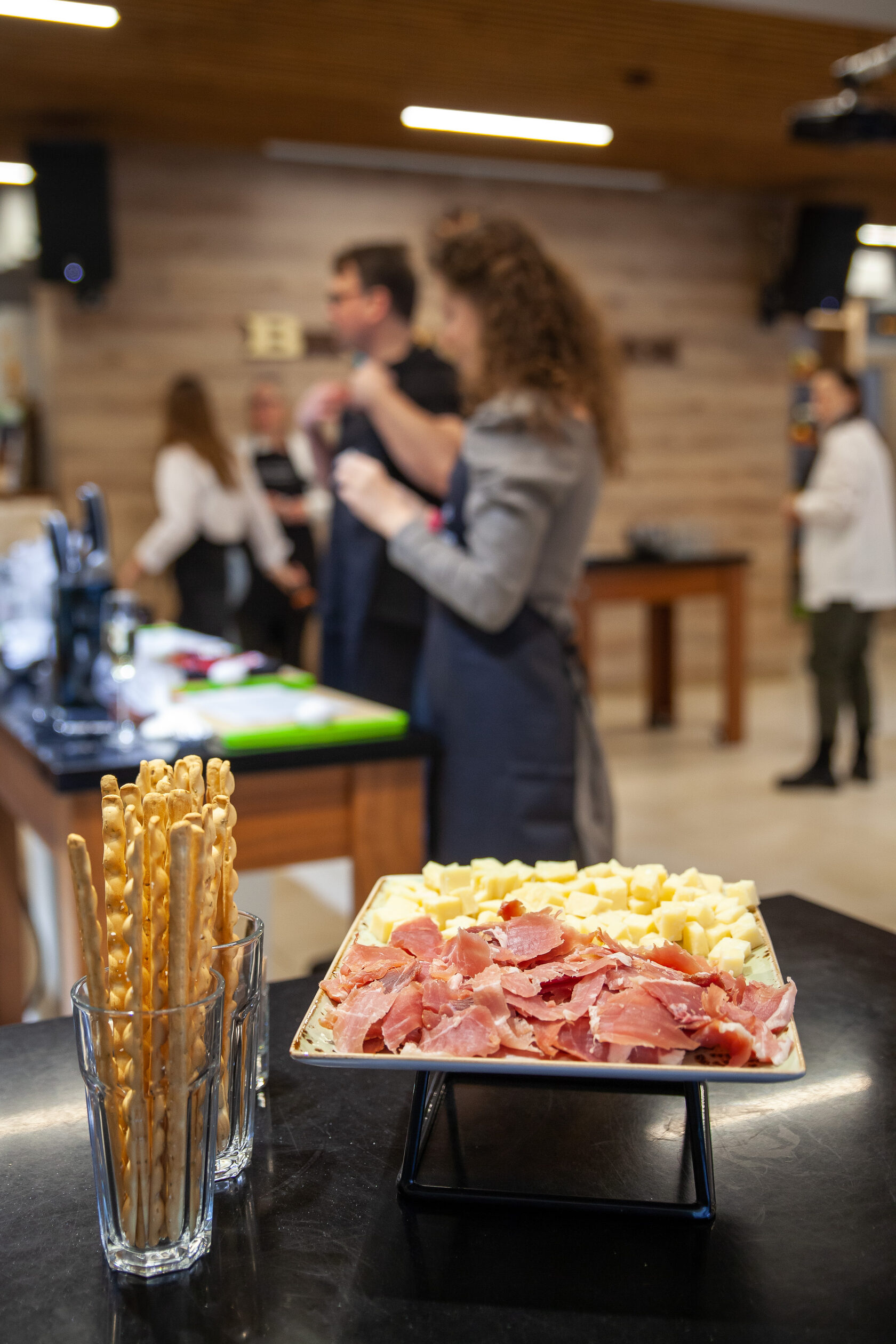 Знакомство со мной и другими гостями за бокалом просекко с итальянскими закусками. Дегустация сыров и колбас из Италии. Я расскажу, что мы будем готовить.